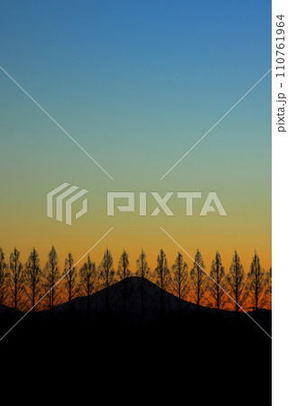 メタセコイア並木越しの夕暮れの富士山
