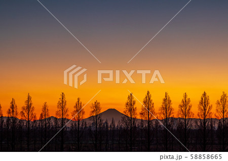 埼玉県 荒川河川敷のメタセコイア並木と富士山の夕景
