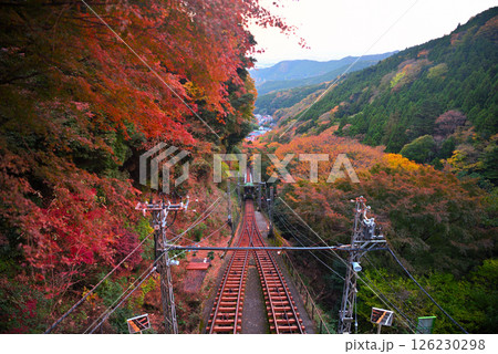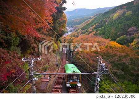関東・大山詣り・大山寺駅から眺める、紅葉の中を進むケーブルカーのイメージ・神奈川県伊勢原市(4)