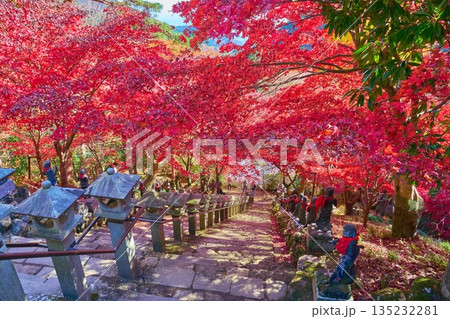 関東・紅葉の大山詣り・大山寺の名所、階段の真っ赤なもみじトンネルのイメージ・神奈川県伊勢原市(2)