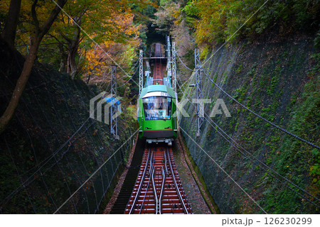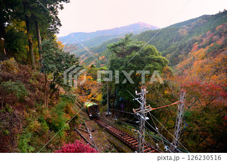 関東・大山詣り・大山寺駅から眺める、紅葉の中を進むケーブルカーのイメージ・神奈川県伊勢原市(6)