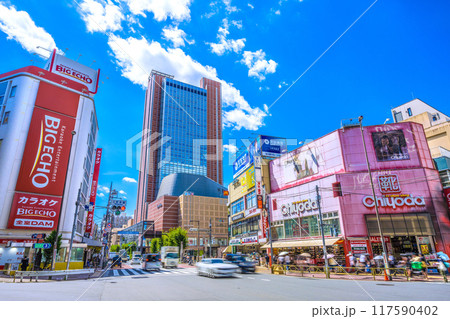 日本の東京都市景観 三軒茶屋駅世田谷通り口や大山道道標などを望む