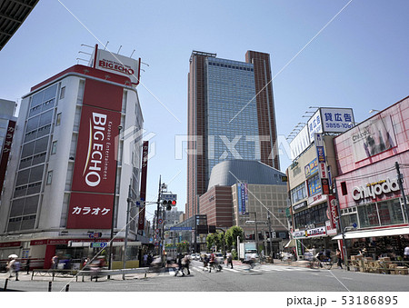 日本の東京都市景観 三軒茶屋駅世田谷通り口や大山道道標などを望む