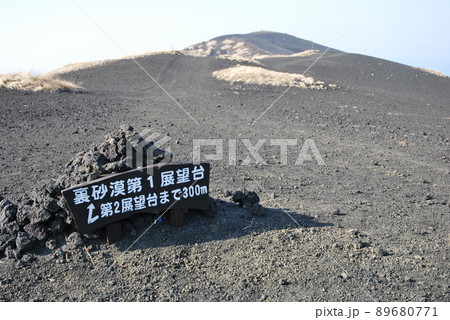 東京都大島町の伊豆大島にある火山三原山お鉢周りで見た雲や霧に覆われた裏砂漠と白石山