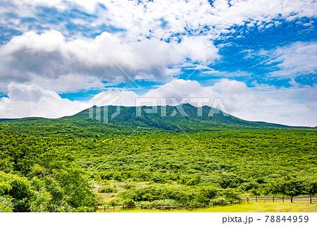 東京都大島町の伊豆大島にある火山三原山頂口からのトレッキングコースで見た三原山の風景