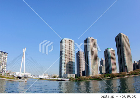 東京 都市風景 永代橋から見た大川端リバーシティー21