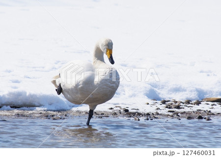 片足を上げて休む北海道の春に訪れるハクチョウ