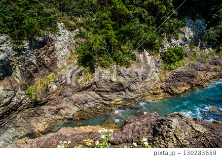 岩の歴史が見れる大御神社から続く海 宮崎県日向市