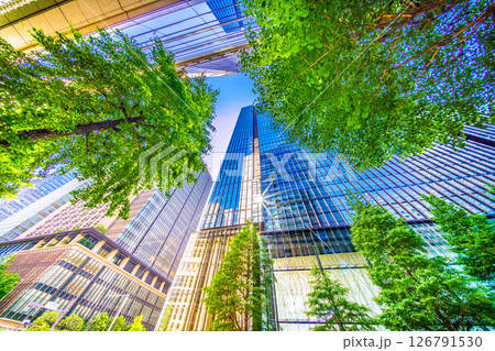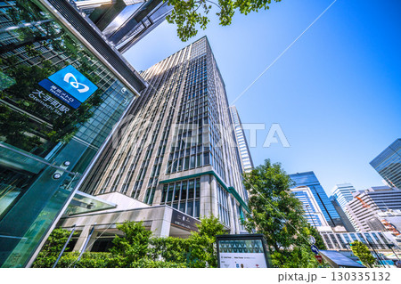 日本の東京都市景観 新緑…「大手町駅前」。オフィスビル群を望む。新たな時代に希望の光