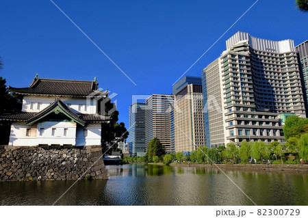 皇居の桜田巽櫓と大手町ビル群