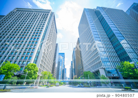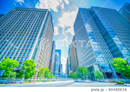 日本の東京都市景観 「大手町駅前」の交差点から青空に映えるオフィス街などを望む(奥は大手門)
