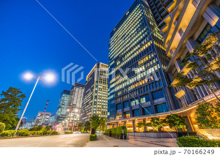 日本の東京都市景観 「大手町」の交差点やオフィス街を望む(夜景)
