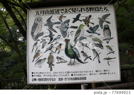 池田市五月山公園 大文字と望海亭各コースの行先表示板の近くの五月山近辺でよく見られる野鳥たちの案内板