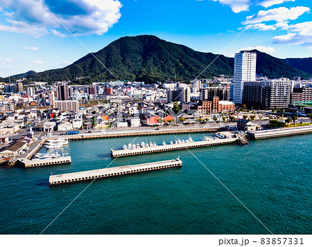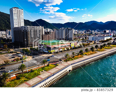 JR門司駅の北側の大里海岸緑地沿いの上空から見た門司駅