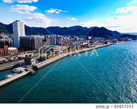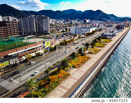 JR門司駅の北側の大里海岸緑地沿いの上空から見た小倉駅方面の景色