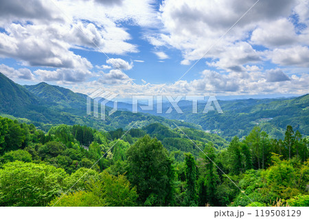日本 長野県長野市鬼無里の大望峠から眺める北アルプスと新緑に覆われた山々