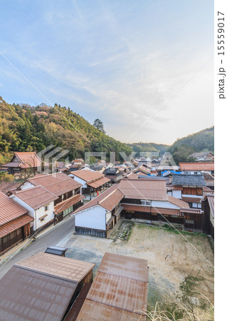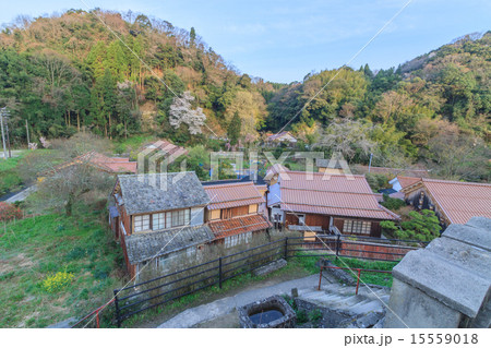 春の早朝の観世音寺からみた石見銀山の大森地区の町並み