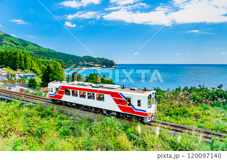 三陸鉄道 青い海を背景に走る列車(吉浜-唐丹)