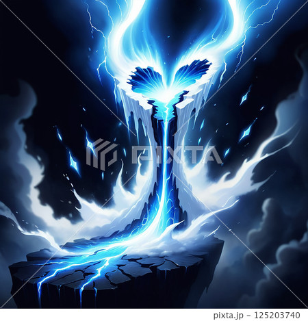 Ethereal waterfall cascading from the sky surrounded by dark clouds illuminated by glowing blue light creating a mystical and captivating scene.