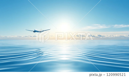 Passenger plane flies over the sea at sunset. The calm sea surface reflects the sunlight. Suitable for travel, tourism and aviation Air and sea background design with free space for text. AI generated