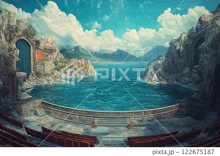 Dramatic theater stage with giant ocean waves crashing in a surreal artistic display