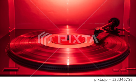 Red vinyl record spins on turntable with vibrant red lighting, retro background. Generative AI