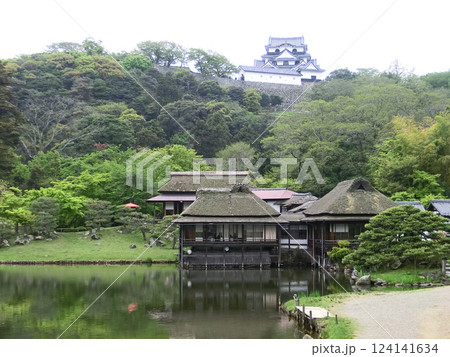玄宮園の臨池閣と彦根城(滋賀県彦根市)