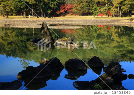 秋の毛越寺浄土庭園 大泉が池 州浜 岩手県