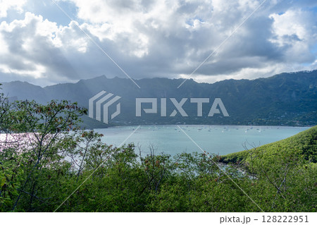 Taiohae Bay and town with anchored sailboats in Nuku Hiva, Marquesas Islands, French Polynesia