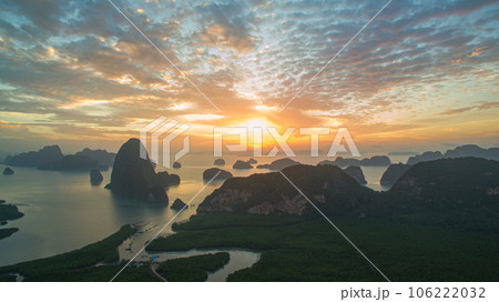 aerial view Amazing light of nature cloudscape sky above Samed Nang Chee Phang Nga archipelago. Imagine a fantasy bright red sky at sunrise from a bird's eye view. tropical landscape background.