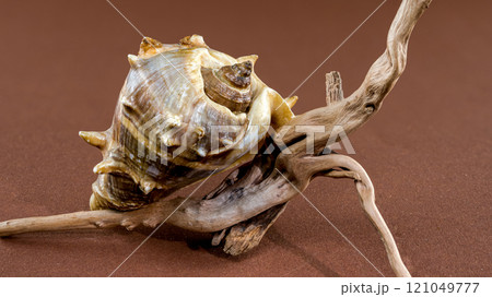 Spiny Melongena Sea Shell Close-Up on on Driftwood