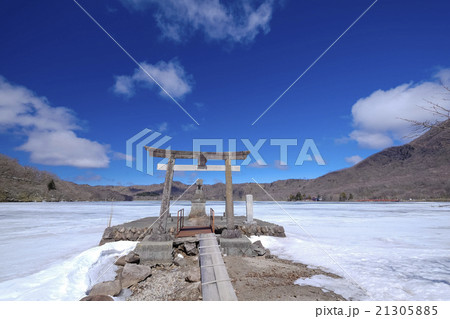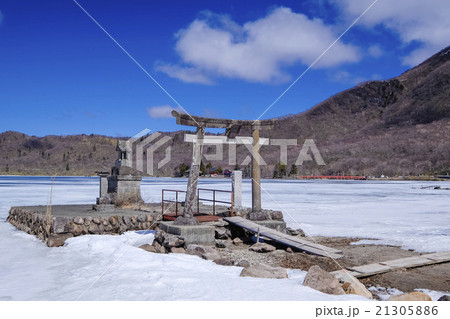 冬の群馬県赤城山 黒檜山の登山口付近から氷結した大沼方面(大沼,地蔵岳,赤城神社など)を見る