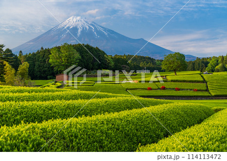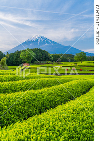 (静岡県)もえぎ色が美しい、富士市・大淵笹場の茶畑越しに富士山