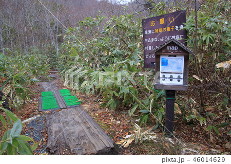 春の尾瀬 雨上がりの大清水休憩所付近の看板