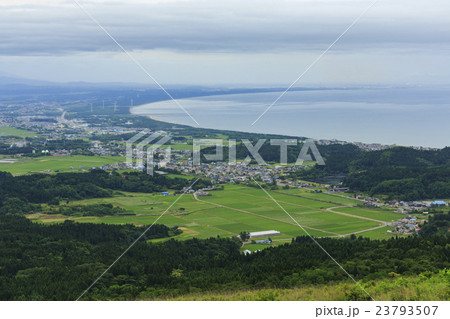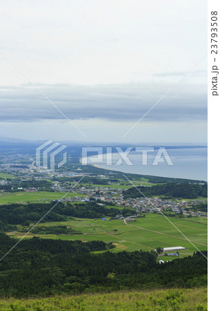 【秋田県男鹿半島】男鹿半島寒風山から見た八郎潟干拓地の水田と日本海