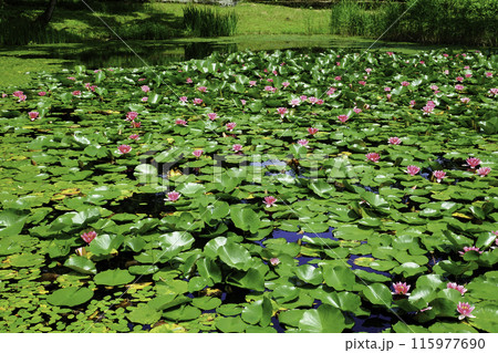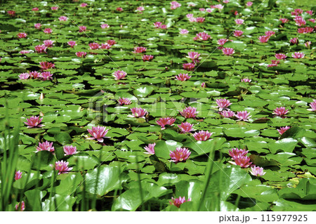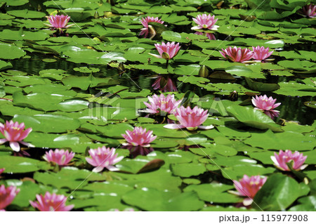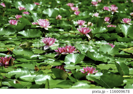 池に群生する睡蓮の花