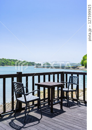 青空光芒に映える海が見える風光明媚な海とベンチ 観光スポット「心のゆりかご」上天草市大矢野町