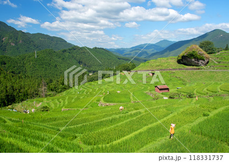 青空に白い雲が浮かぶ夏の丸山千枚田