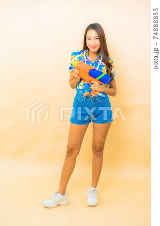 Portrait beautiful young asian wear colorful shirt for songkran festival