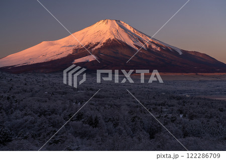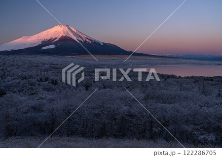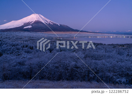 《山梨県》冬の富士山・夜明けの山中湖パノラマ台の眺望