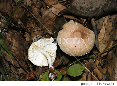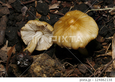 雑木林の腐葉土にオオキヌハダトマヤタケ茸(笠とヒダ、両面を並べたストロボ+マクロ撮影)