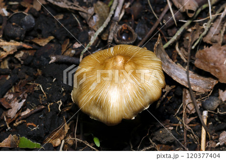 カサの表面が絹のように細く放射状に裂けるオオキヌハダトマヤタケ茸(自然環境下マクロ撮影)