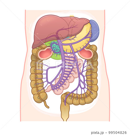 肝臓、門脈、脾臓、大腸、小腸、十二指腸、膵臓のイラスト