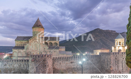 The Svetitskhoveli Cathedral aerial day to night timelapse. Mtskheta, Georgia