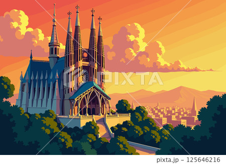 Vibrant Digital Illustration of Sagrada Fam?lia at Sunset