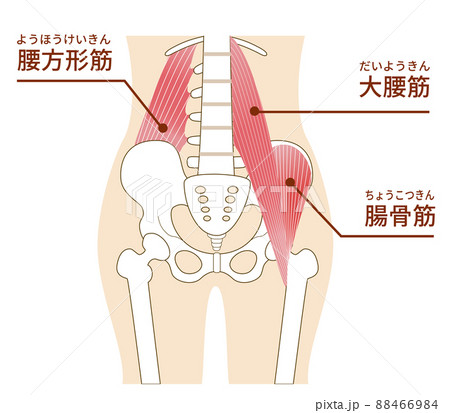 腸腰筋、骨盤周辺の筋肉、大腰筋、小腰筋、腸骨筋、大腿骨、筋肉、股関節、腹、腰、尻、イラスト