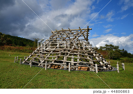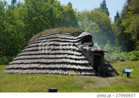 北海道函館市旧南茅部の大船遺跡で復元された縄文時代の竪穴式住居のある風景を撮影