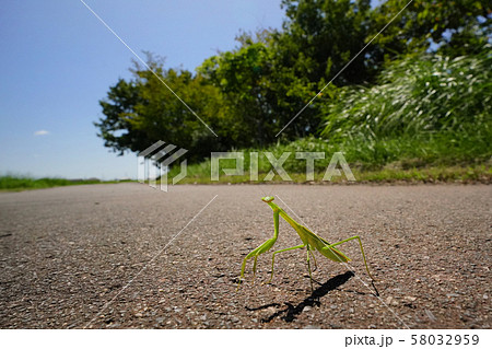 アスファルトの上を歩く大カマキリ(昆虫)