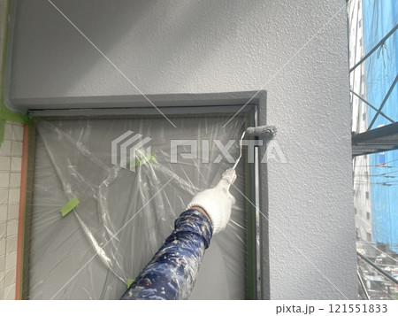 リシン吹き付け外壁に下塗り作業