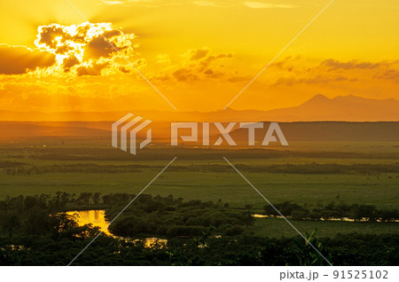 釧路湿原と釧路川と雌阿寒岳と霧と夕日